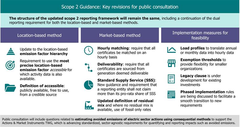 Following recommendations from the Scope 2 Technical Working Group and approval by the GHG Protocol Independent Standards Board to progress to public consultation, revisions to the Scope 2 Guidance (2015) will be shared through a 60-day public consultation period, starting in October. In the proposed revisions, the structure of the updated scope 2 reporting framework would remain the same, including a continuation of the dual reporting requirement for both the location-based and market-based methods. Changes to the location-based method (e.g., updated emission factor hierarchy, requirement to use the most precise emission factors accessible, a new definition of accessible data) and market-based method (e.g., hourly matching requirement, deliverability requirement, new emission factor requirements) prioritize improved accuracy, greater transparency, and provide more comparability inventory values for use by external disclosure frameworks and initiatives. The proposed revisions also introduce several measures to improve the implementation feasibility of the updates (e.g., load profiles for hourly matching, exemption thresholds to hourly matching for smaller organizations, a legacy clause for existing contracts, and a multiyear phased implementation). This is the first of several communications in a series leading up to and continuing through the Scope 2 public consultation. These updates will help explain what is being proposed and why, providing additional context for stakeholder engagement. Future blog posts will delve into hourly and deliverability requirements and provide guidance on how to participate in the upcoming consultation process.